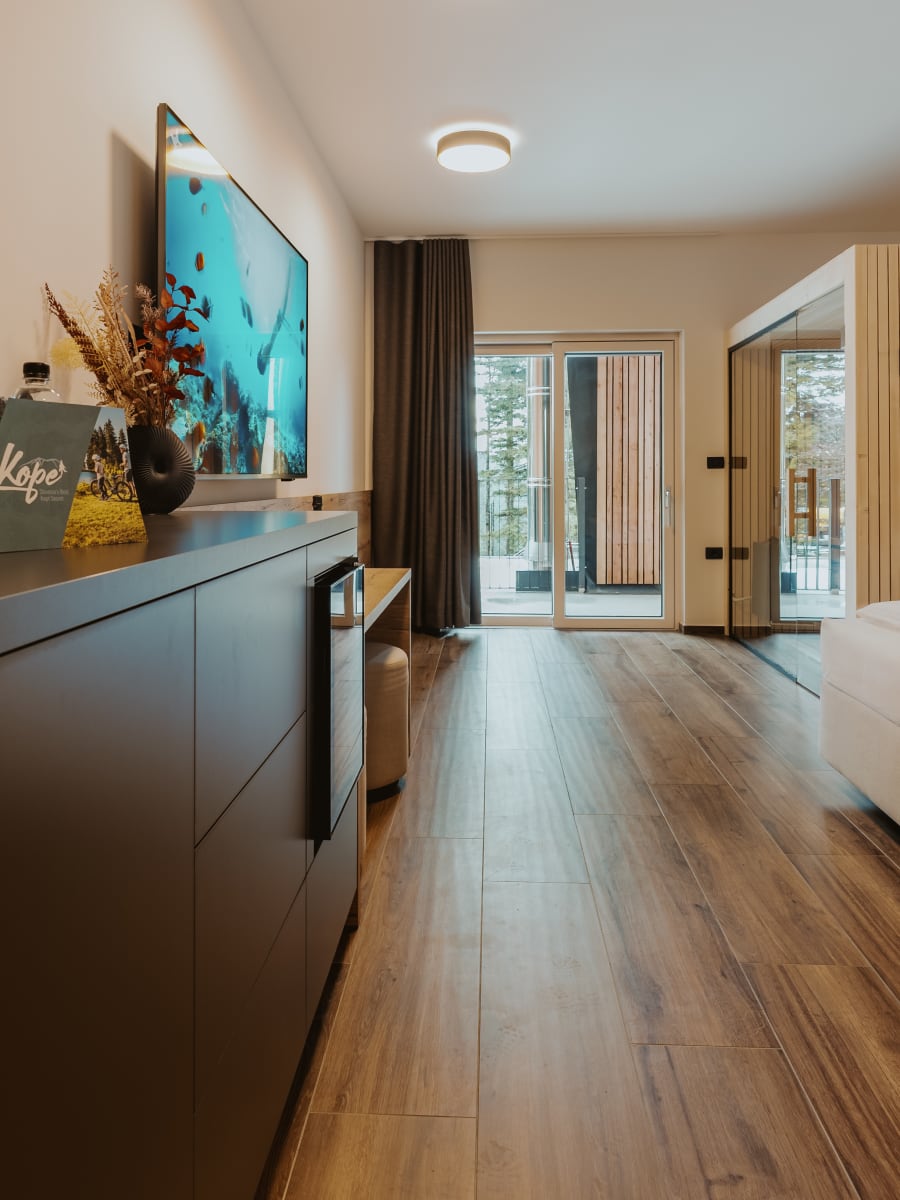 Suited to couples or families wanting a bit more space and privacy to unwind. Fitting 2 to 4 people, this bigger room offers breakfast and dinner, wellness access, a locker room for your bike, plus a private jacuzzi in the bathroom and sauna. It's a comfortable choice for added relaxation.